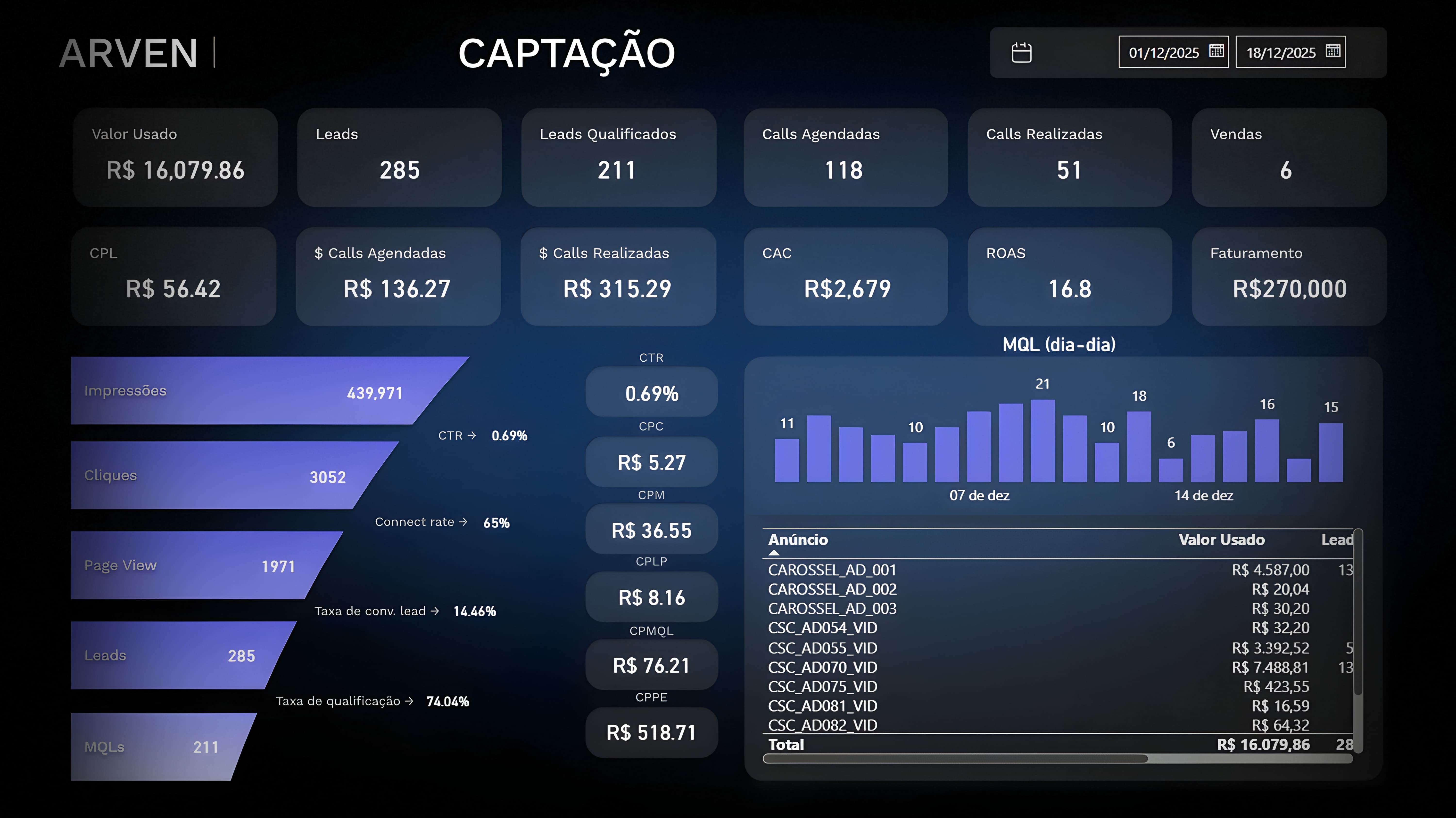 Foi esse modelo que nos deu a experiência necessária para, hoje, gerenciar mais de R$ 5 milhões em mídia mensalmente, operar uma base que já ultrapassa 60 contas entre parceiros e clientes, e construir a Arven para um patamar de faturamento projetado em R$ 12 milhões em 2026. Não como promessa, mas como consequência de um sistema que escala com controle.
